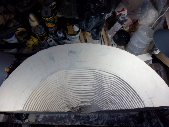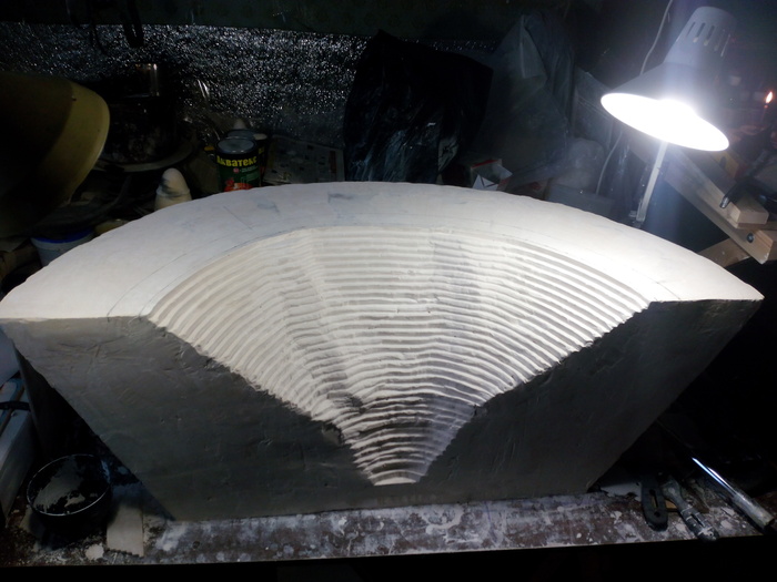 Сначала сделали из гипса вот такую тяжеленную заготовку. Шпатель, инструмент типа Dremel и куча энтузиазма.