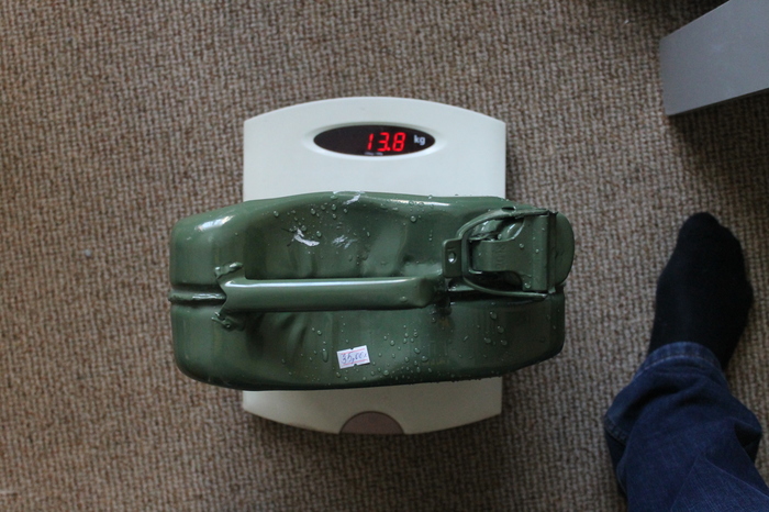 upd: 1 л воды примерно весит 1 кг. Значит если я залил 11.6 кг воды, объем канистры составляет 11.6 литра. Суть данного опыта в том, чтобы показать что надпись 10 литров на канистре, ничего не значит.