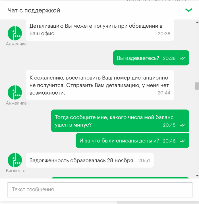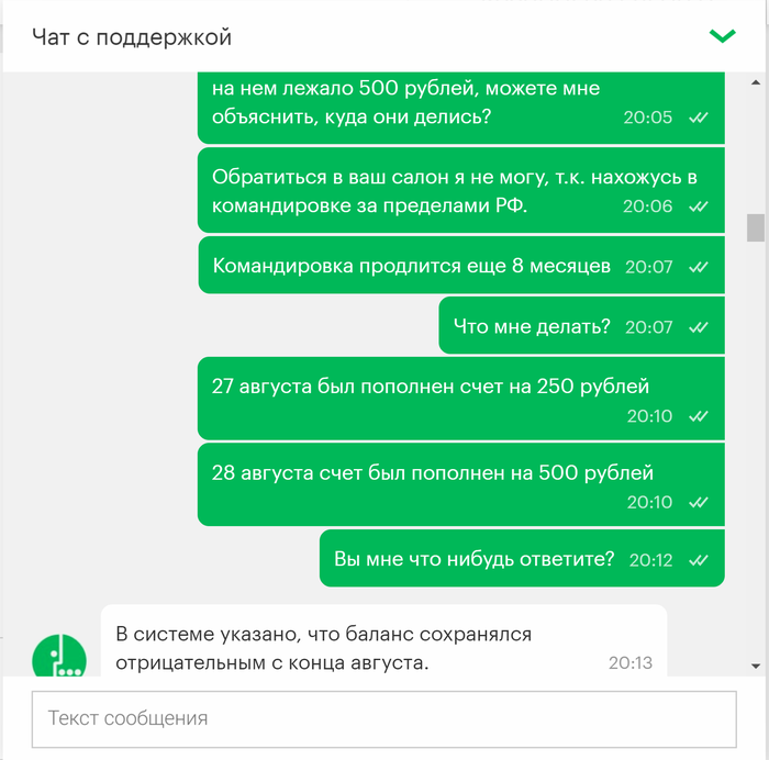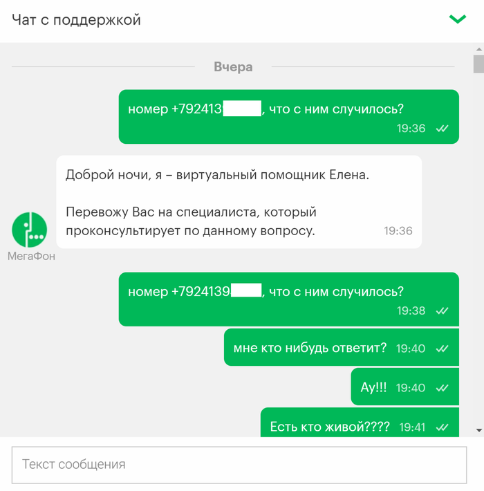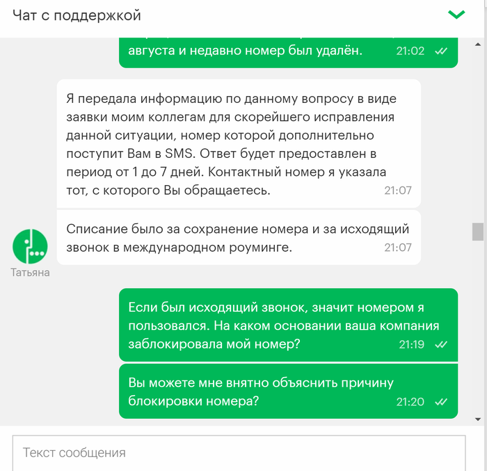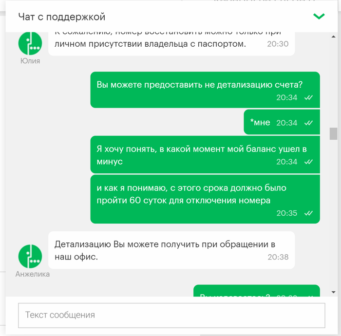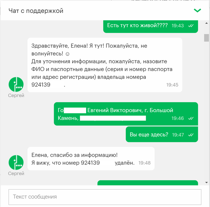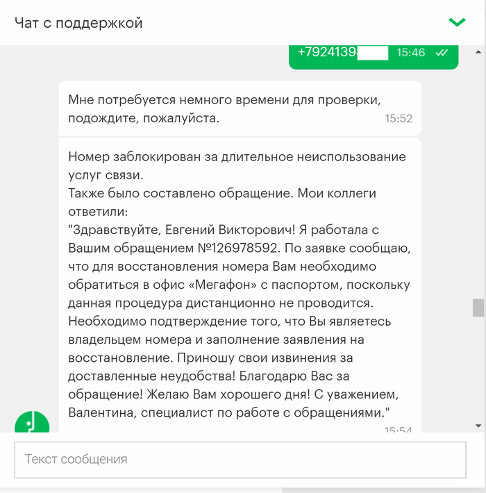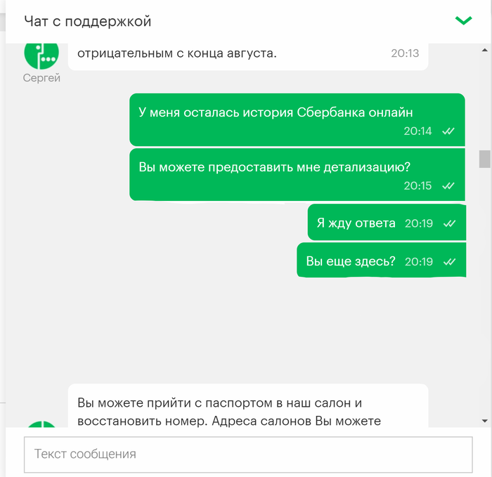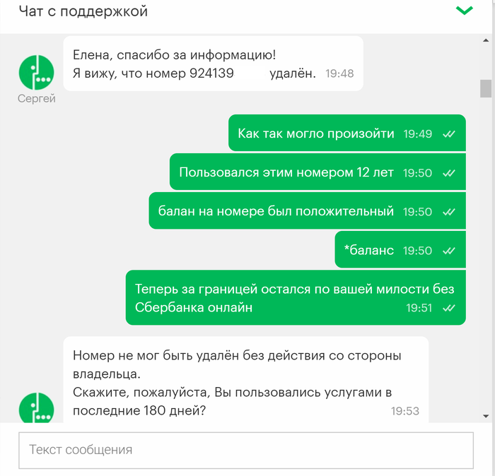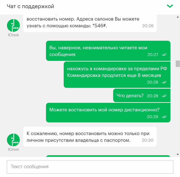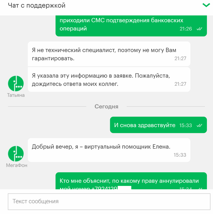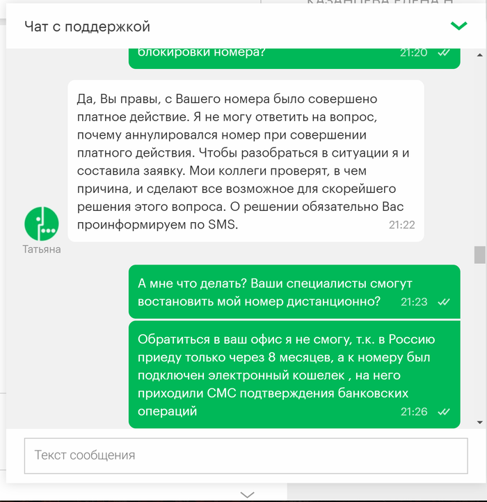 Привет всем! Это мой первый пост, давно являюсь читателем Пикабу и сейчас прошу совета у старожилов ресурса. Нахожусь в командировке за пределами РФ, мегафон аннулировал мой номер, причем внятную причину для этого так и не назвал. Не знаю что делать, остаться за границей без сим карты к которой привязан эл. кошелек, сбербанк онлайн врагу не пожелаешь. Выкладываю переписку с поддержкой мегафон.