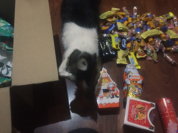 Кошка решила что это ее подарок и мишка отправился в кошачий домик на постоянное место жительства))