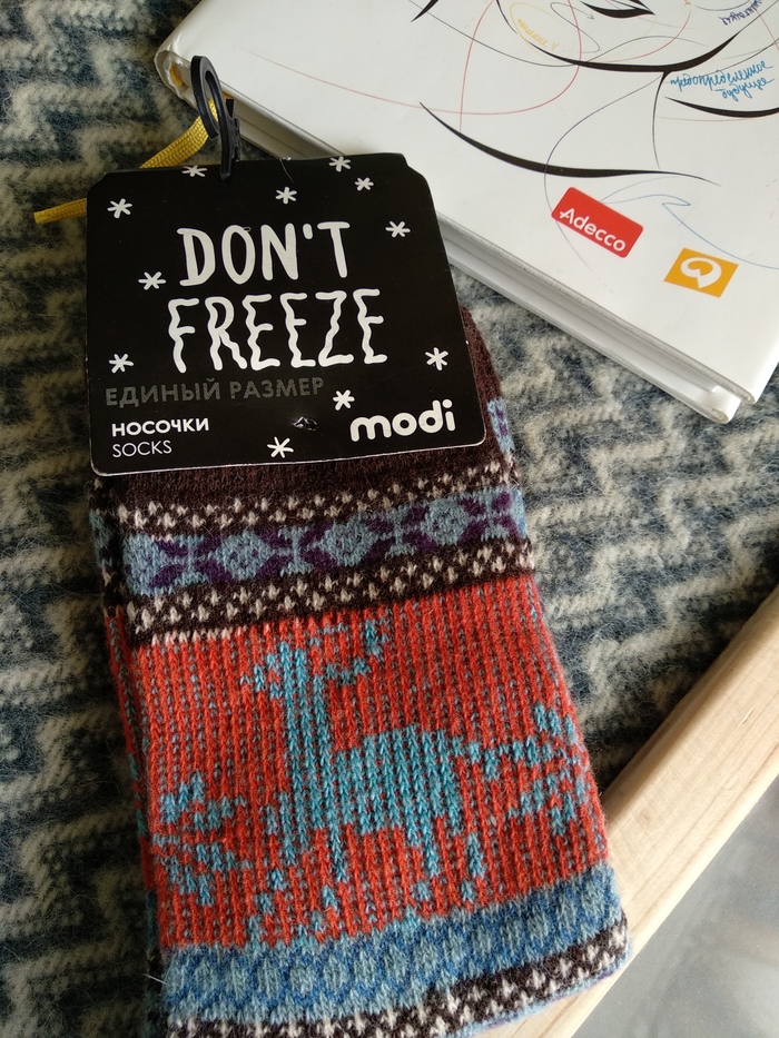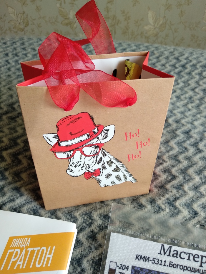 Конфетки в пакетики с новогодним жирафом-сантой, теплые носочки и открытка (жалко не подписана,было бы ещё приятнее). И общий вид подарка