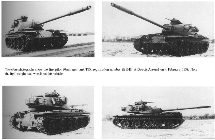 Собственно, программа Т95 – это программа создания двух танков, а именно среднего Т95, вооружённого 90 мм гладкоствольным орудием, а также тяжёлого Т96, вооружённого 105 мм гладкоствольным орудием либо 120 мм орудием от тяжёлого танка М103. Оба этих танка были друг с другом предельно унифицированы, вплоть до того, что на пятикатковое шасси среднего Т95 смогли поставить башню шестикаткового Т96. В течении нескольких лет было предложено множество различных вариантов вооружения и башен для Т95, в том числе установка башни от М48 с 90 мм орудием, установка стабилизированной 120 мм британской пушки, а также возможность вооружения танка ПТУР, пускаемой не со ствола, а с направляющих на башни, поскольку сам ствол заменялся на ракеты.