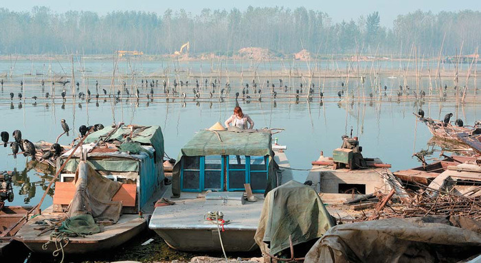 Рыбаки с бакланами на оз. Вэйшань. На заднем плане бакланы на своих присадах прямо в озере
