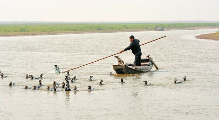 Рыбак достает из воды баклана с уловом на оз. Поян. Рыбу необходимо забрать у птицы, прежде чем снова отпустить ее в воду