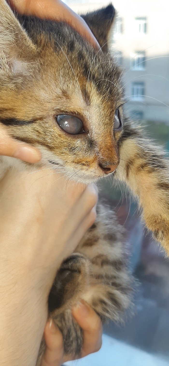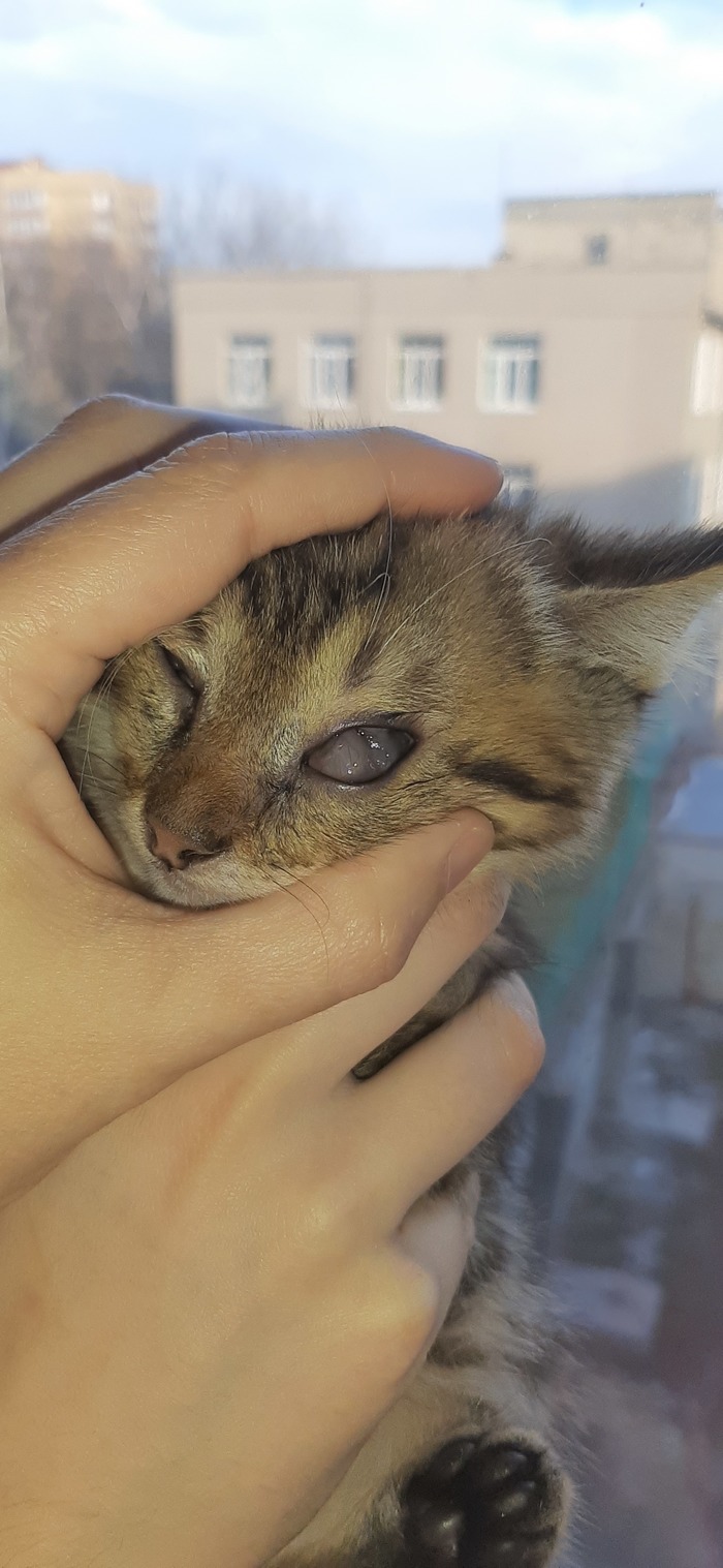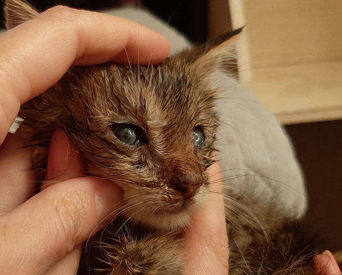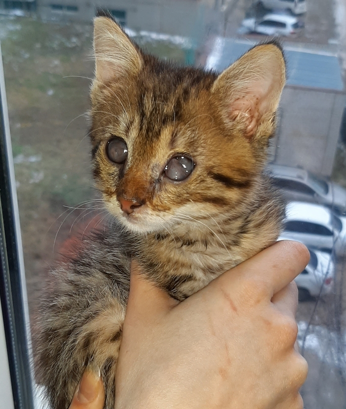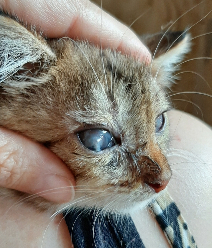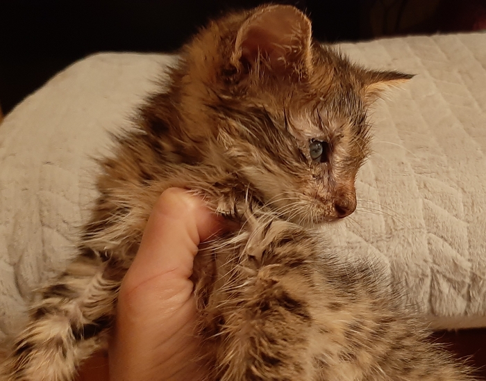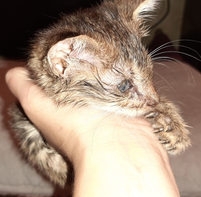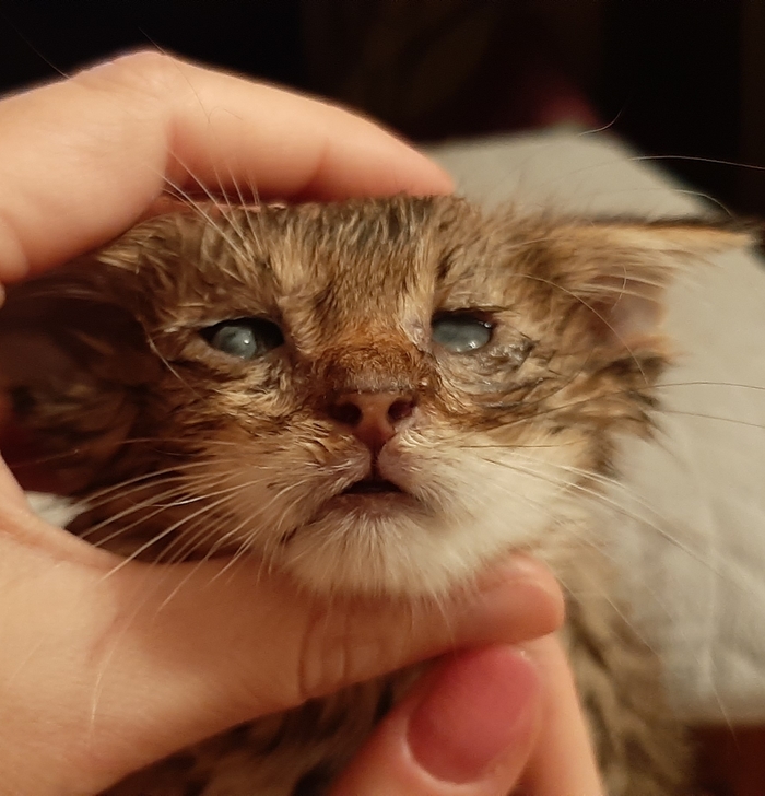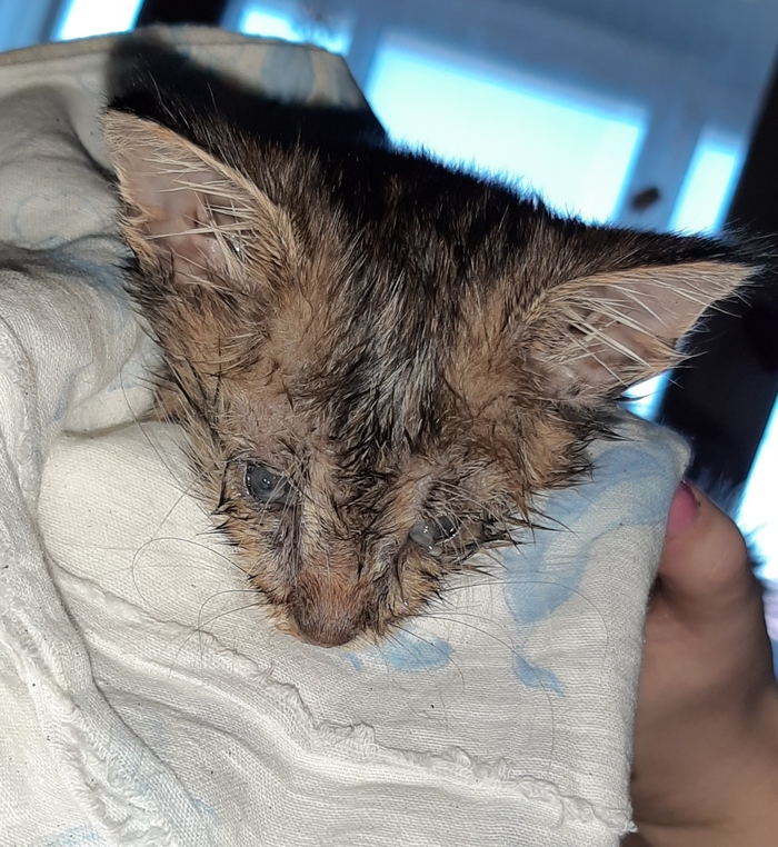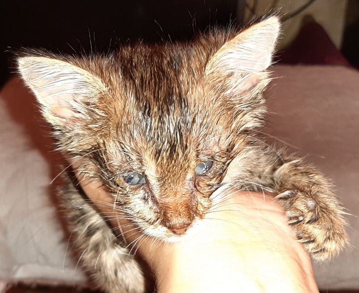 Но все оказалось не так. Принесла она не котенка, а кусок гноя и грязи. Он был значительно меньше Мышика, и был просто трупом - висел тряпочкой. Вся морда в гное, он не мог дышать. Я, если честно, до сих пор не понимаю, как он бежал тогда за мужиком? Может тупо судьба - чтоб я увидела? Потому что он был обезвожен, переохлажден, ослаблен до состояния нестояния и весь в гное.