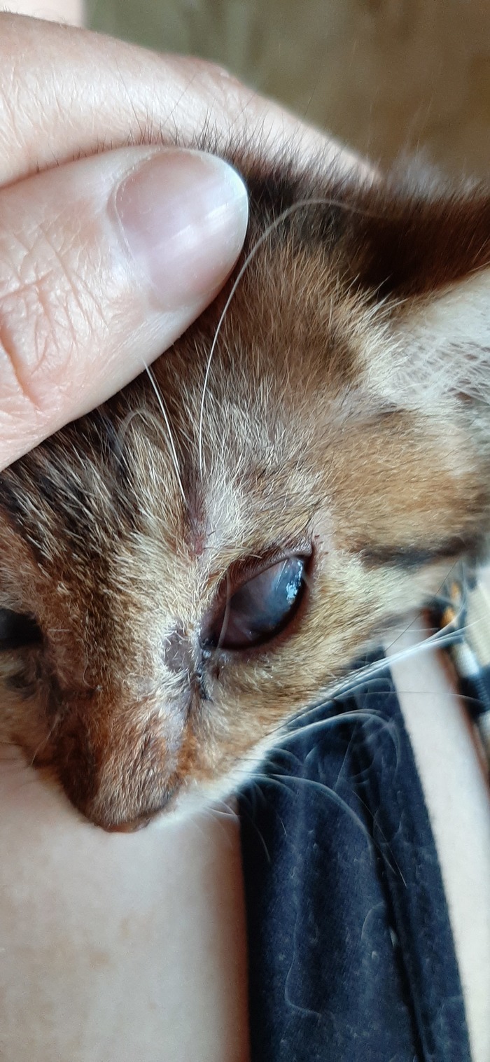 Глаза открывала принудительно. Изначально оба были с кератитом (мутные). На правом была киста - как будто весь глаз в пленке и в одном месте пузырь-шарик такой. Левый был просто мутный.