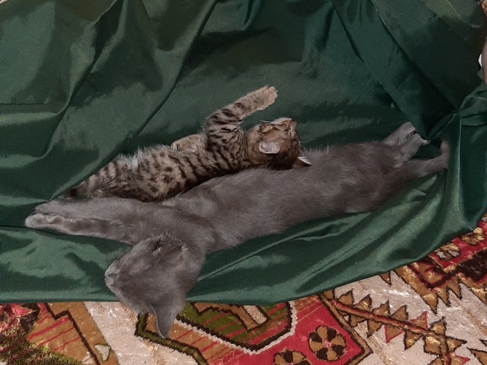 Старшие смирились. Подшипливают еще иногда некоторые, но так, для порядка. А добрейшая Маська вообще его по-мамски обнимает-вылизывает. А с Мышиком он, конечно, лучший друг - с кем же еще беситься-играть. Ходит по дому. Ест в общем месте уже общий корм. Обожает дочку, спит только с ней на подушке и встречает ее из школы. Сам. Прибегает.
