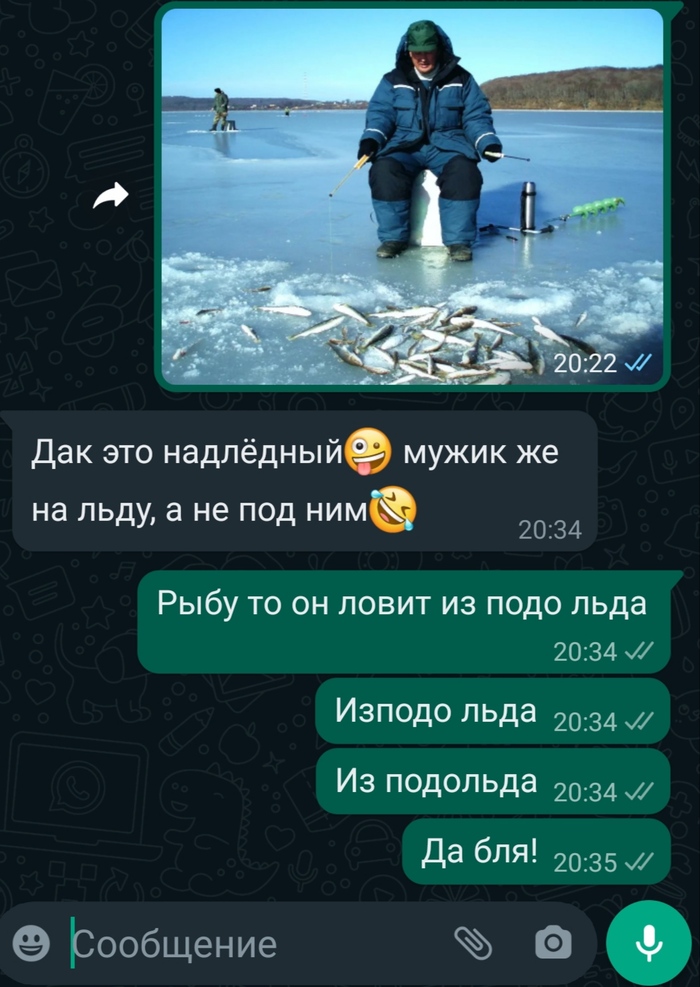8 DELETED Подлдный лов 2 года назад Оказалось "из-подо льда") Показать полностью 1 [моё] Зимняя рыбалка WhatsApp Переписка Скриншот Ещё 0