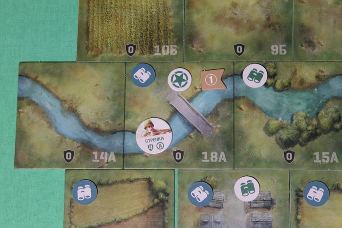 Чтобы точка оказалась захваченной, стрелки перемещаются в нужный квадрат. И переворачивают жетон бинокля на другую сторону действием «захватить». Но сделать это можно, только если поблизости нет вражеских отрядов. Согласитесь, трудно считать мост захваченным, если на другой его стороне ошиваются вражеские разведчики и активно по нам постреливают.