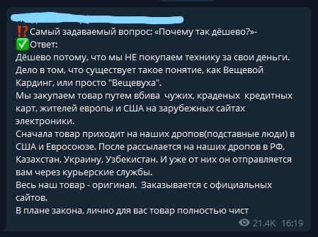 -Техника по заниженным ценам. Официальная гарантия от производителя. - На счет гарантии. Интересный момент. То есть у вас на руках товар, который куплен с помощью чужой банковской карты. Напоминаю, его стоимость примерно от 200 до тысячи долларов. Владелец карты заметил бы такое списание рано или поздно и обратился бы в магазин или полицию. Но его как бы перевезли через дропов в вашу страну и отправили уже вам якобы чистым. И при таком раскладе вы думаете реально сдать этот товаром с чеком по гарантии ? Насколько нужны быть тупым, чтобы это сделать и насколько тупым, чтобы указать это в описании, как одну из 3 самых важных особенностей магазина.
