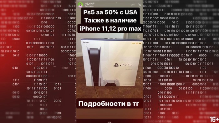 Так как я регулярно разоблачаю мошеннические схемы, время от времени, подписчики спрашивают моего совета и в какой-то момент прислали следующую рекламу в Инстаграмме. На изображении видно новую Playstation5. И текст: "PS5 за 50 процентов с США, также в наличии айфоны. Подробности в ТГ".