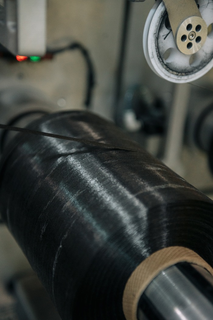 Константин показывает углеродную ленту, которая поступает на завод в бобинах.