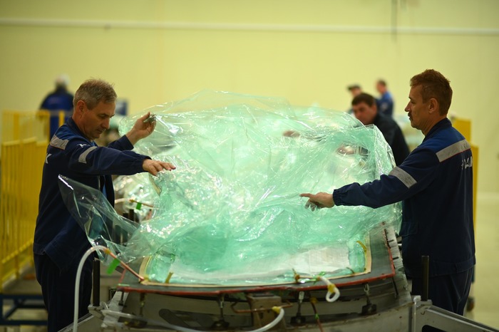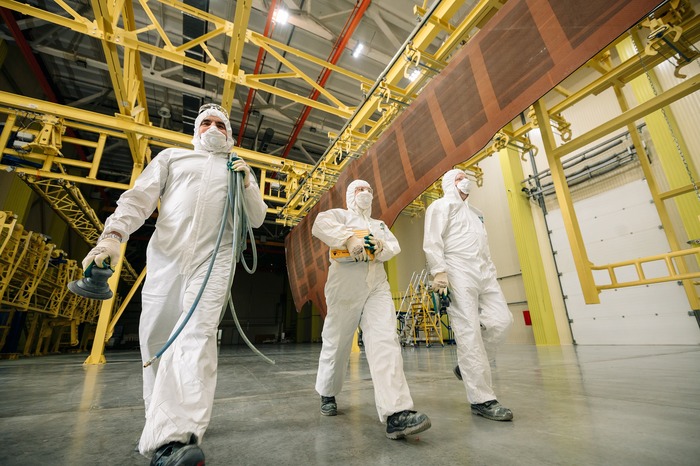 Мы заходим внутрь в традиционной униформе (халат, бахилы, шапочка). Исследовать завод нам помогли Константин Бозоров (заместитель начальника композитного производства) и Альберт Зиганшин (заместитель начальника агрегатно-сборочного производства по подготовке производства).