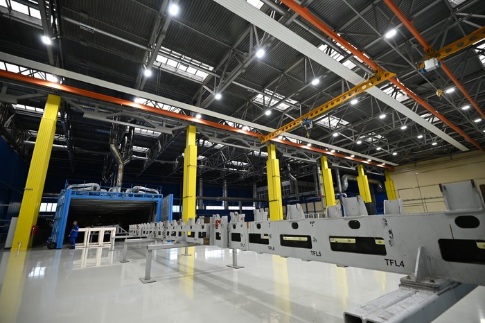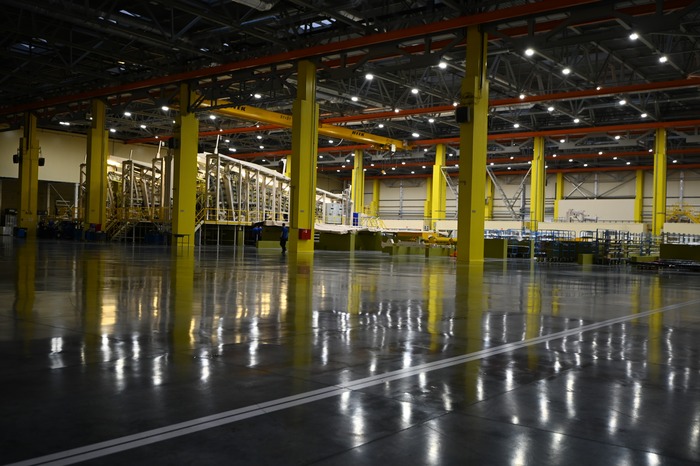 Напротив зона где, располагаются мощности под сборку киля стабилизатора МС-21, здесь же разместили рули высоты, руль направления – полностью весь хвост самолета в одном месте.