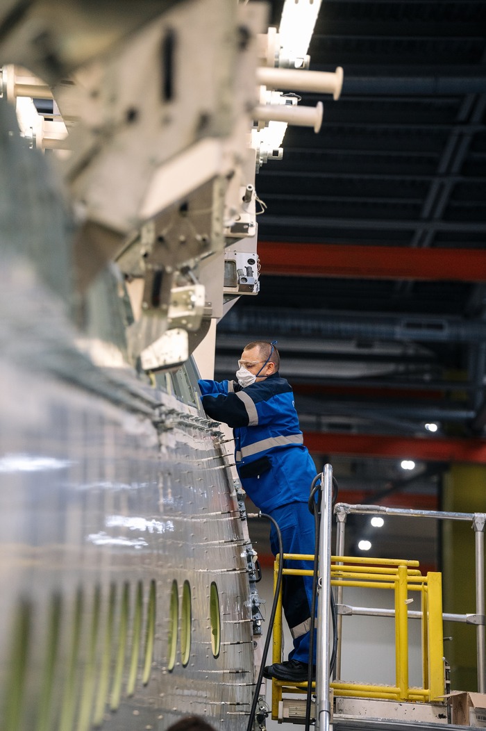 До этого транспортировка и сборка агрегата из станции в станцию происходила в вертикальном положении, а на завершающем этапе в Станции окончательной сборки кессона крыла МС-21 сборка происходит в горизонтальном положении агрегата. Альберт подводит нас к наиболее оживленному в данный момент участку. Тут идут работу по сборке кессона крыла МС-21 комплекта МС.0020