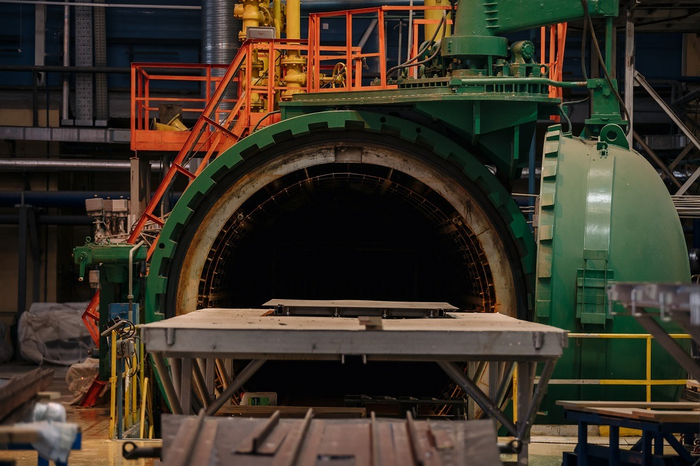 Мы подходим к огромной печи (пока еще не инфузионной), где происходит процесс нагревания изделия для придания ему формы методом горячего формования.