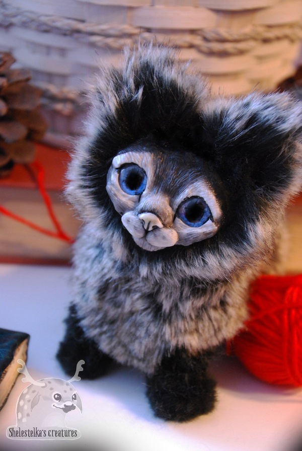 Мордочки и подушечки на лапках из запекаемой глины, тельце из искусственного меха. Оба кота на проволочном каркасе, внутри так же синтепон и стеклянный утяжелитель.