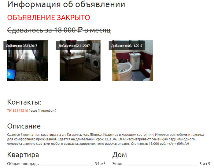 Со следующим описанием: «Сдается 1 комнатная квартира, на ул. Гагарина, маг. Яблоко. Квартира в хорошем состоянии. Имеется вся мебель и техника для комфортного проживания. Сдается на длительный срок. БЕЗ ЗАЛОГА! Рассматривают семейную пару или одного человека, можно с детьми любого возраста, животных тоже рассматривают. Стоимость 18.000 руб. +к/у + 60% АН» С указанием контактного номера +79182144316