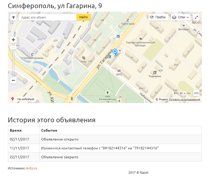 02.11.2017 разместил на сайте Авито объявление «Квартира в аренду, Симферополь, ул Гагарина, 9»
