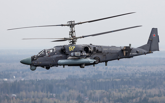 Ка-52 «Аллигатор» - российский разведывательно-ударный вертолёт. Способен поражать бронированную и не бронированную технику, живую силу и воздушные цели на поле боя. Представляет собой дальнейшее развитие модели Ка-50 «Чёрная акула». Преемственность Ка-50 и Ка-52 очень высока — до 85% комплектующих изделий и агрегатов.