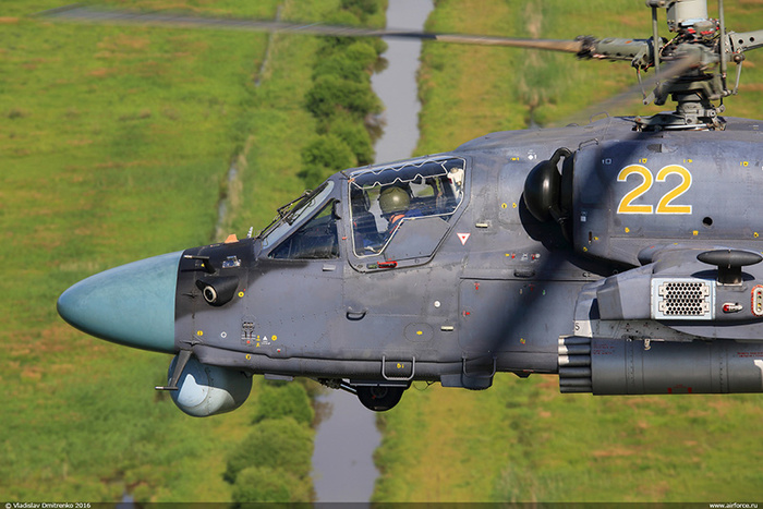 Ударный вертолет Ка-52 также создан по соосной схеме, он имеет два несущих винта и не имеет рулевого. Наиболее важные узлы самолета надежно бронированы, также защищена броней и кабина пилотов. Шасси могут убираться, что существенно улучшает аэродинамические характеристики машины. На вертолете стоят модернизированные двигатели ВК-2500, с мощностью 2400 л.с. Большой потолок машины позволяет ей эффективно выполнять боевые задачи в условиях высокогорья. Также двигатели машины снабжены специальными приспособлениями, которые рассеивают выхлоп машины и уменьшают ее заметность в инфракрасном диапазоне. В кабине машины расположены два специальных кресла, К-37-800, которые в случае необходимости могут катапультироваться. Перед катапультированием происходит отстрел несущих лопастей вертолета.