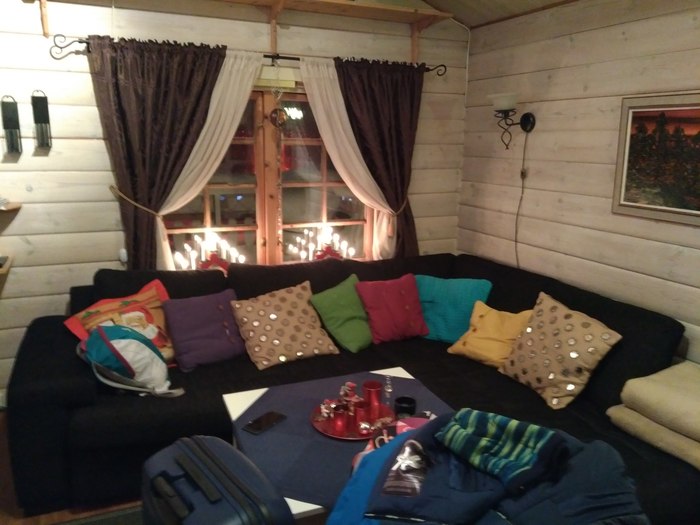 Мы арендовали домик в 130 километрах от Тромсё в небольшой деревушке среди гор (у них это называется cabina). Я мечтала, что это будет уютный деревянный домишко с большим, заваленным подушками диваном в гостинной, камином и свечами. Так и случилось. Это был тот исключительный случай, когда то, что вы видите в реальности, оказывается гораздо лучше и уютнее того, что хозяева показывают на фотографиях.