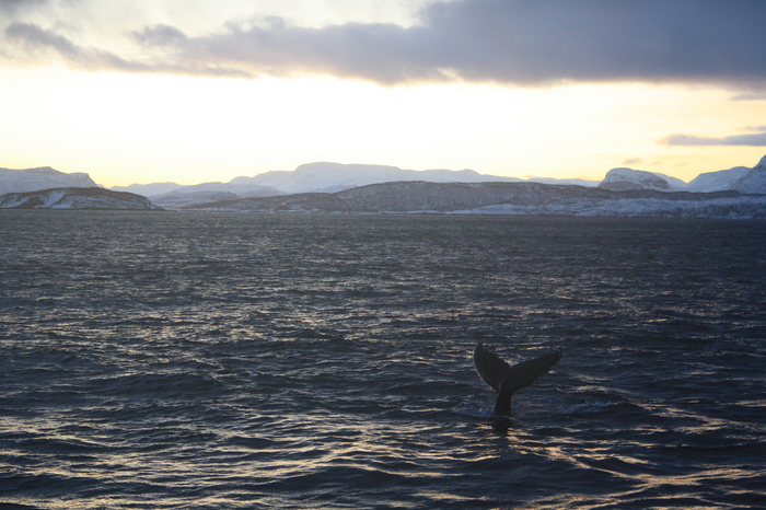 Это экскурсия. Очень дорогая экскурсия. Но довольно необычная. Вас не водят по залам, не собирают у экспонатов и не рассказывают историю происхождения каждого из них. Нет. Вас сажают на огромный лайнер и два часа везут по фьордам, среди прекрасных видов на заснеженные горы к месту, где в это время года в естественной среде обитает и кормится целая стая китов. Настоящих! Живых! Таких огромных! Выныривающих из воды со своим своеобразным пением, выбрасывающих струи воды и показывающих красивые и уникальные для каждой особи хвосты!