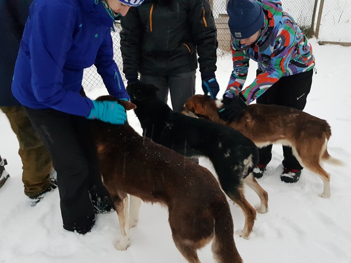 Томми Ларсен познакомил нас с собаками (в основном, хаски и лайки), рассказал об их содержании, какие наиболее приспособлены к гонкам, научил впрягать и распрягать. Животные оказались очень контактными, особенно щенки, которых стаей выпустили к нам в самом начале: в первые пять минут мы просто стояли на коленях и охапкой сгребали бегающих вокруг собакенов!