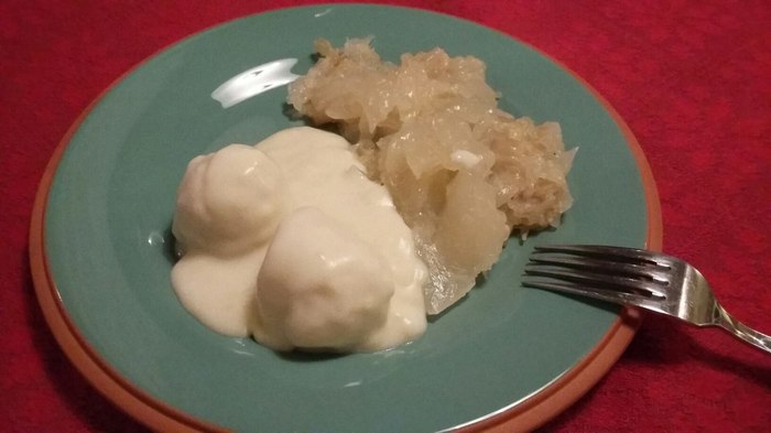 И спрашивали во всех магазинах, в которых бывали. Найти рыбу посчастливилось в последний день и совершенно случайно. Мы просто купили обычную тушку, которая при распаковке дома оказалась совсем необычной. Приготовлена она была неправильно, но вроде никто не отравился. На фото ниже совсем не мороженное с капустой, это лютефиск с какими-то местными полуфабрикатами в каком-то местном соусе: