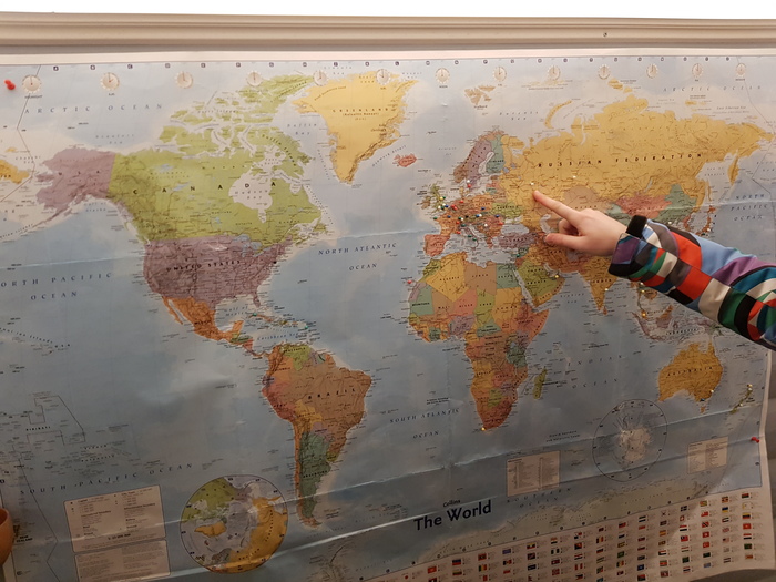 На этой карте Томми отмечает города, жители которых побывали у него в гостях. Наша отметка: