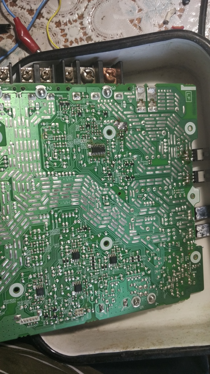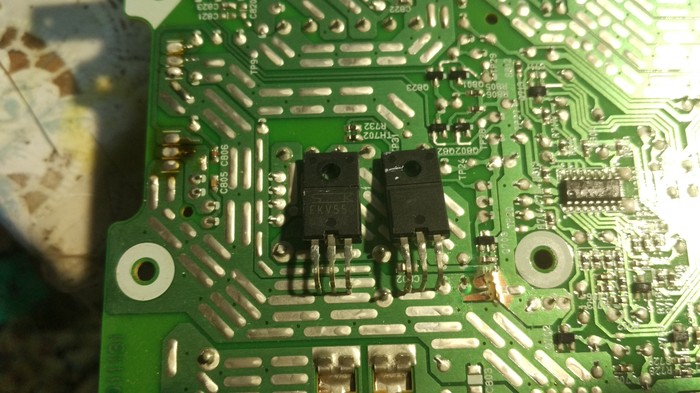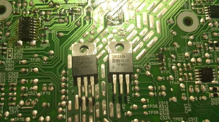 Справа дорожка выгорела. Как потом оказалось туда идет вывод который через отверстие подцеплен на корпус. Как потом клиент сказал провод от тряски вылетел из клеммы, и скорее всего последний коротнул на корпус из-за чего и выбило полевики и сгорела дорожка в столь странном месте (это не тот отвод по которым течет огромный ток)