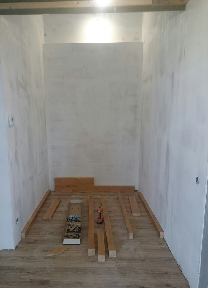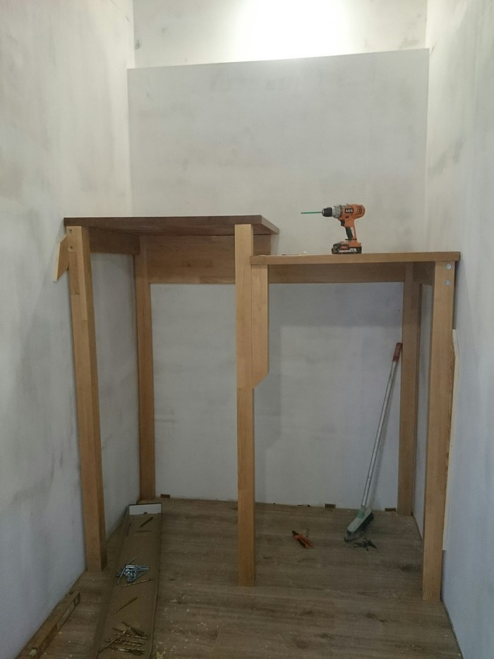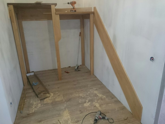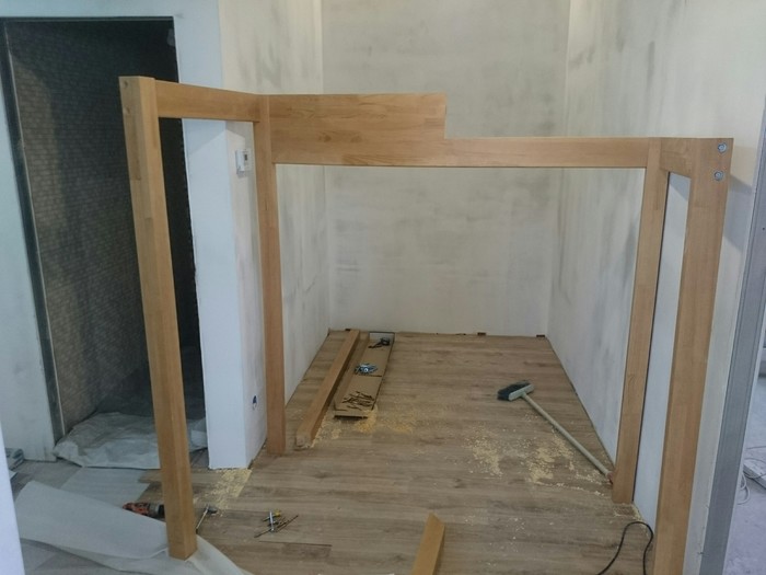 Вообще надо стараться меньше времени проводить на монтаже. Дольше переводится как возня, видна ручная работа и прочие ошибки сами лезут. Отбойник запилен в цехе с небольшими припусками, на месте же спилил низ по полу, а сверху он встал по высоте плинтуса(на площадке наш плинтус).