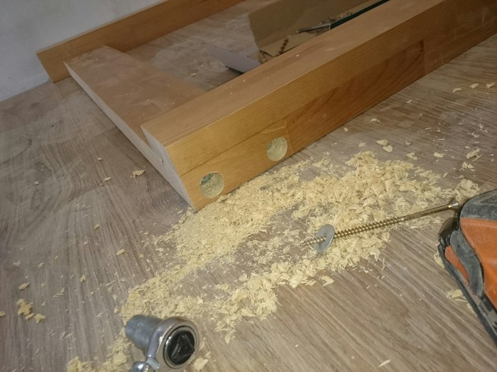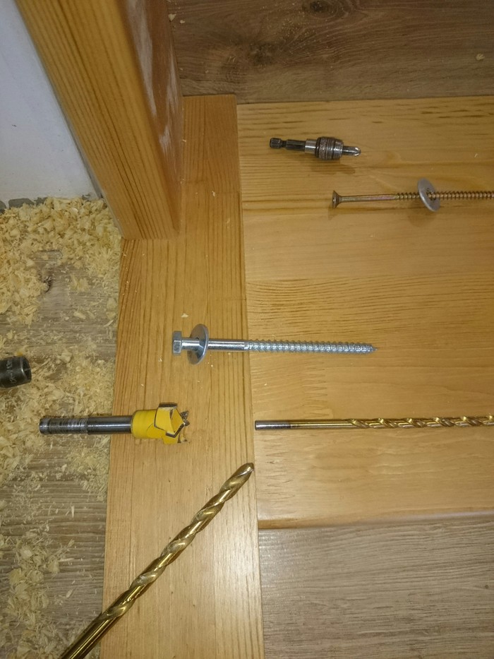 Сборка на винты(глухари). Обязательно сверлим: пером,два сверла. На фото глухарь лежит как он должен быть внутри - спиральная часть в прижимаемой детали. Желтый саморез для временного удержания - пером проходим, потом сверлим брус, притягиваем. Потом спокойно можно под глухари сверлить и затягивать. Расположение винтов - руководствуемся здравым смыслом. Т.е. в склейку не надо и тянем несущие ламели.
