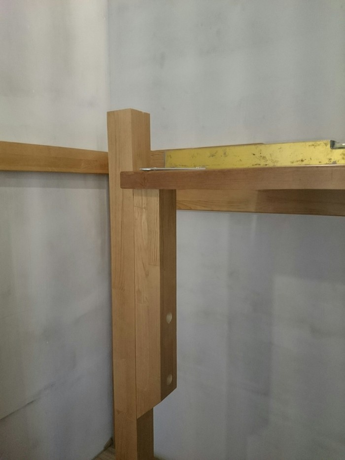 Далее идут площадки. К ним приготовим отверстия в техбрусе, а также центральную стойку. На последней прикрутим сбоку также брус по уровню, но не до пола(длина 500мм и скос под 45град.). Второй марш(он слева будет) упирается в брус 80*80, он более нагружен здесь, а первый на 50-х брусьях(50*80).