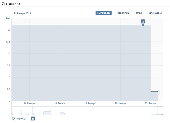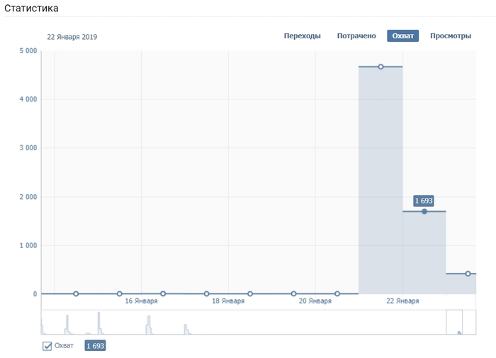 1. 21-22 Января, размещение рекламного блока за 281 рубль в одной из групп ВК. С нее получил 2 заказа из 18 переходов на сайт. CPC 15.6 рублей получился. Стоимость лида получилась 140.5 рублей(Что весьма дорого), заработок составил с 2х заказов 730 рублей( Хоть в плюсик)). Суммарный охват порядка 7500 уников. Реклама отбилась ( ставлю повторный опыт 01.02 в другой группе). Регистраций - 7.