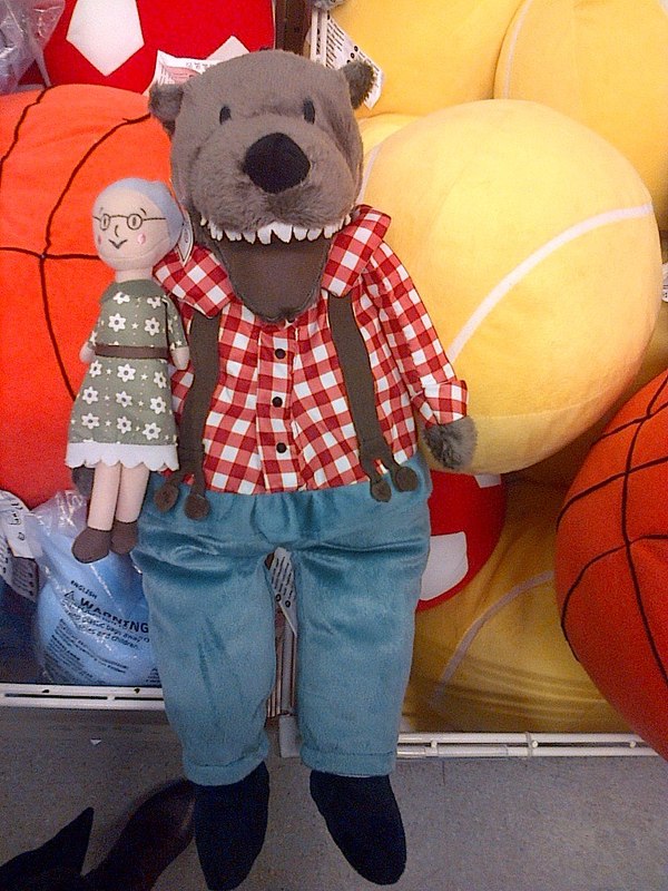 На первый взгляд радостная бабушка (кто то считает, что это девочка) и дружелюбный волк (по мнению некоторых медведь). И Все счастливы, все довольны.