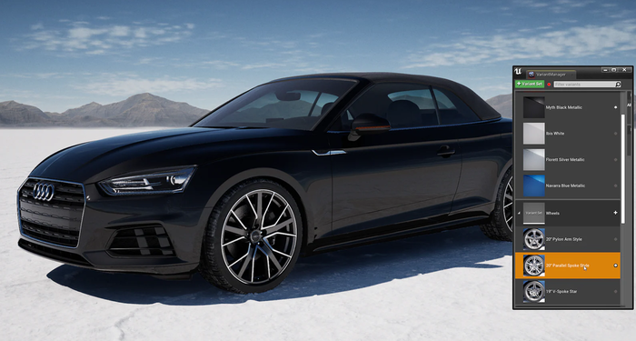 Epic Games в сотрудничестве с Audi Business Innovation GmbH выпустили Automotive Configurator, пример полного реалтаймового конфигуратора. Проект демонстрирует полностью интерактивную модель кабриолета Audi A5.