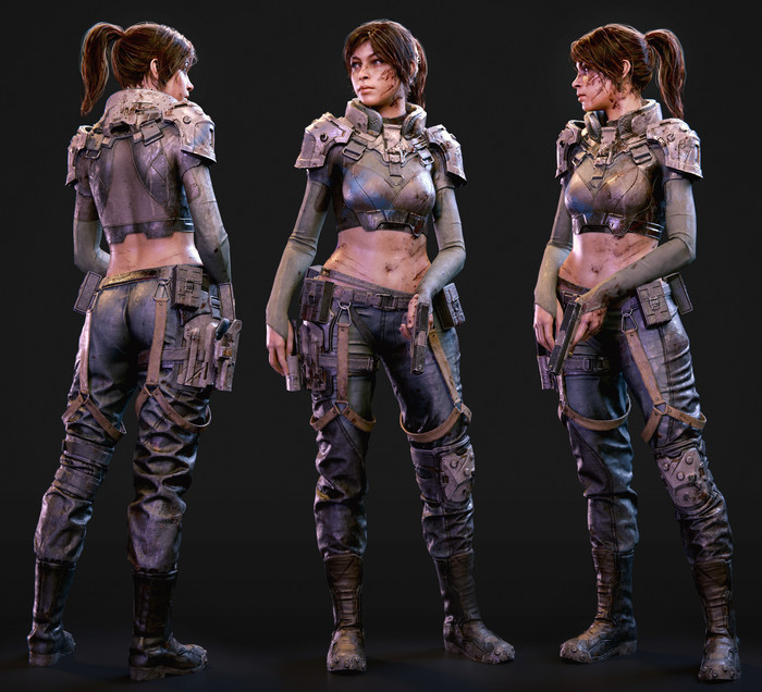 При работе использовал Marmoset Toolbag 4. Карточки волос ручками в Blender, вылеплено в ZBrush. Лоуполи и UV сделаны в 3DsMax и текстурированы в Substance Painter. В костюме персонажа 80к треугольников. Для волос 31к.