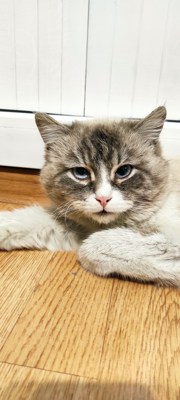 Гулял по Острову Канта и там обнаружил кошечку, которая жила в сливных решётках . Задняя лапка была оторвана и она её постоянно зализывала (кусок лапы-голое мясо на кости). Повёз в клинику - лапу отняли , и появилась у нас дома очередная кошка , но трёхлапая . Муся!