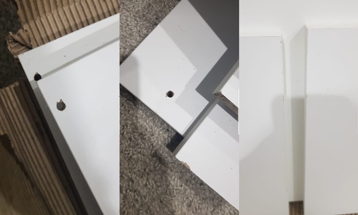По мере того, как заносили коробки - я их сразу вскрывала, чтобы осмотреть на наличие дефектов. И это была жопа, каждая деталь в каждой из коробок была со сколами, мне на самом деле хотелось плакать, но делать нечего и это лучше чем ничего, в крайнем случае можно будет купить дверцы по размеру в леруа и повесить их. (забегая вперед скажу - материал дверц мы выбрали чуть дороже, чем каркас и они оказались в целом неплохими)