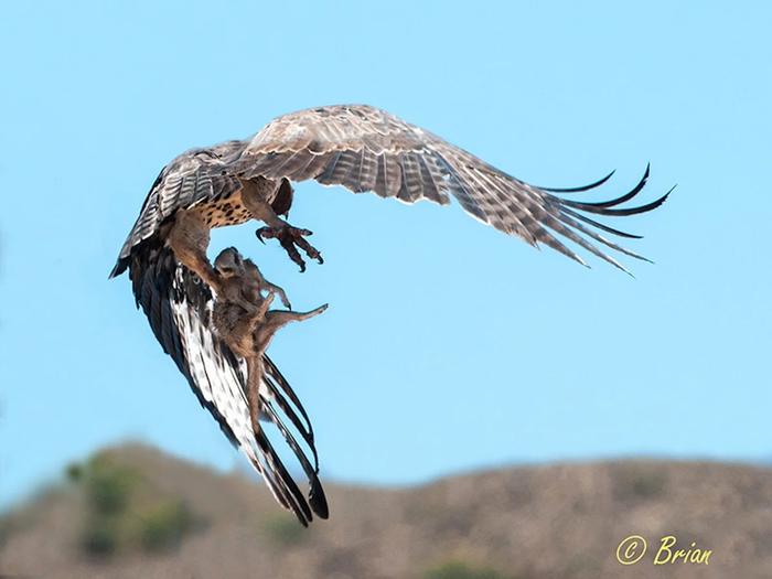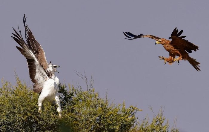 Пока один орёл постоянно мельтешит перед глазами, отвлекая жертву, второй заходит со спины и наносит удар. Острые когти + мощный клюв + ускорение, набранное во время полёта, = смертоносный удар, который вырубит даже человека, что уж там говорить про более мелких животных?