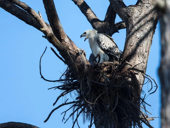 Но вместо медового месяца молодожёнов ожидает сезон строительства. Ради единственного птенца родители мастерят гнездо диаметром в 2 метра на протяжении 5 месяцев! Обзаведясь жилплощадью, самка обзаводится и яйцами. В кладке их не больше 2, но с вероятностью в 95% выживет лишь один.