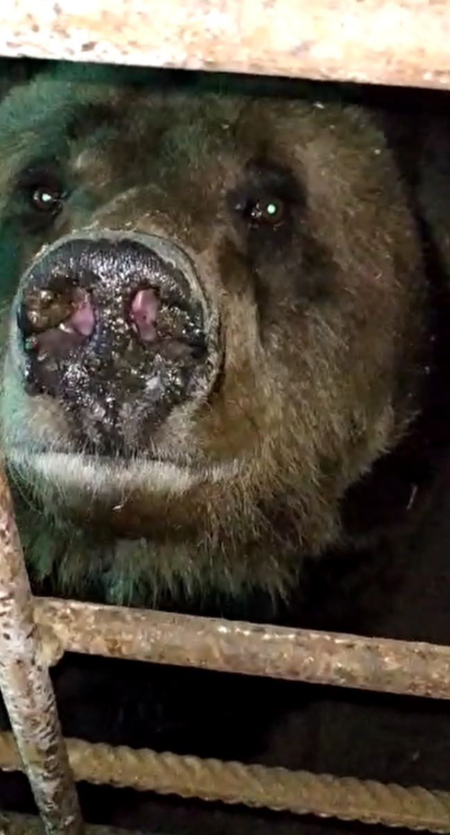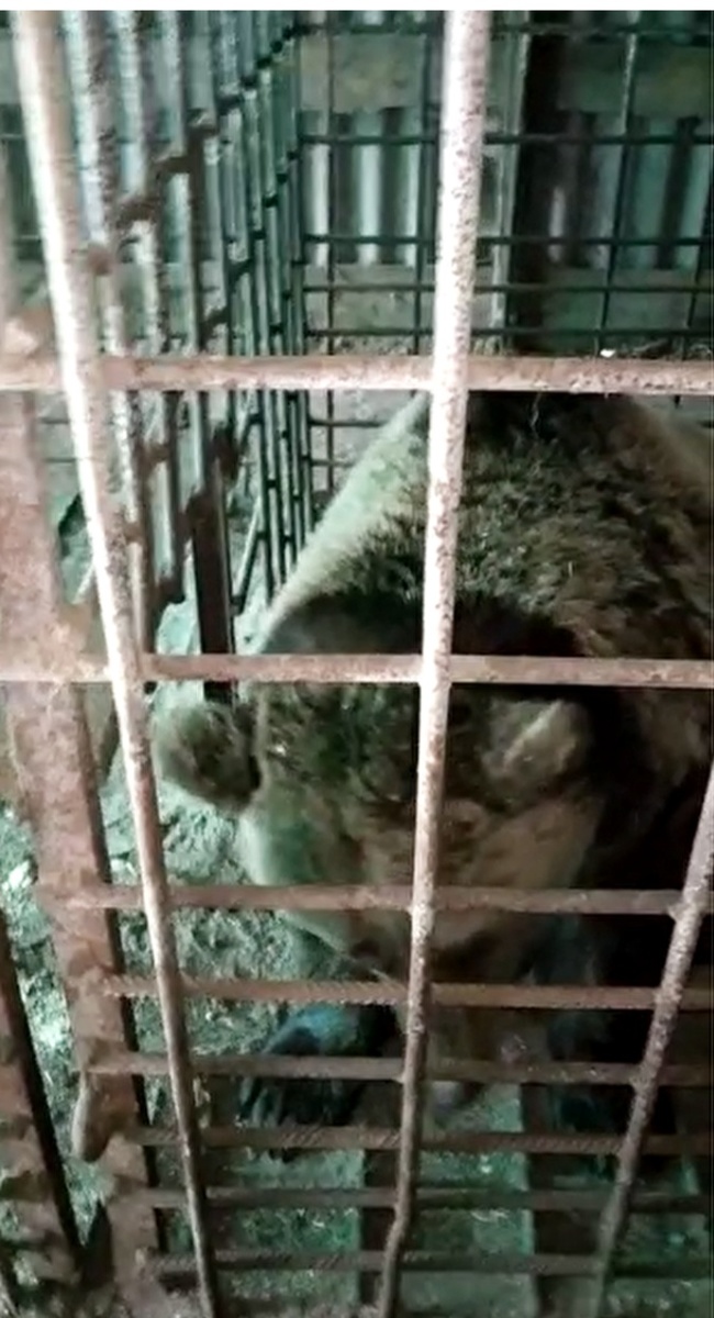 Как выяснилось, это была медведица. Ужасные условия «жизни», грязь, ни еды, ни воды, Клетка примерно 3 на 3м, под замком. Выпускали только "для дела".