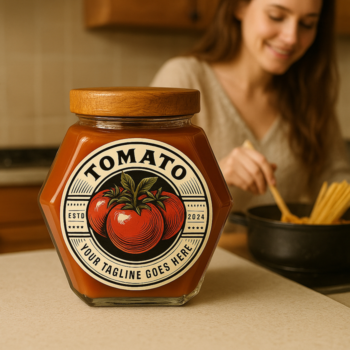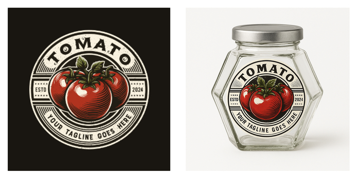 Заранее подготовила дизайн: скачала круглую винтажную этикетку с томатами со стока. Попросила наложить её на банку — оставить только круг, убрать чёрный фон. На первый взгляд всё было на месте, но что-то смущало.