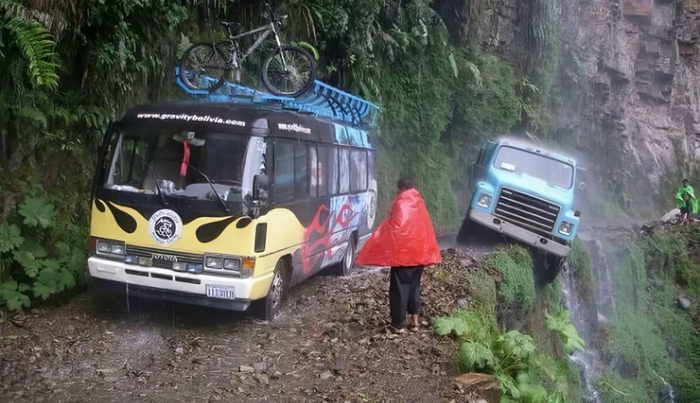 Скользкий, покрытый мокрой грязью узкий спуск длиной в 61 километр — вот, что представляет собой знаменитая трасса Юнгас, дорога смерти.