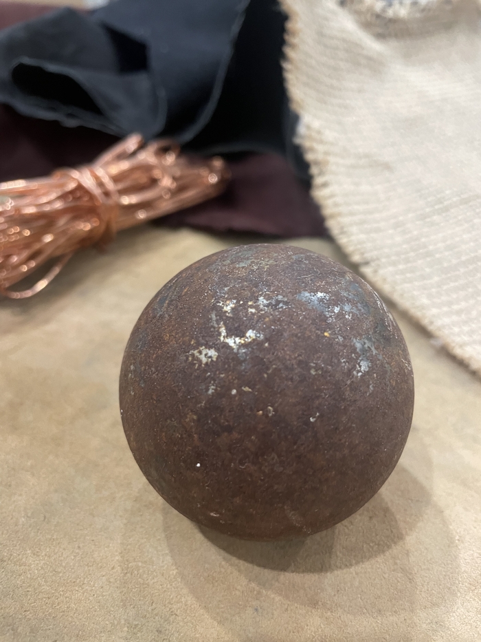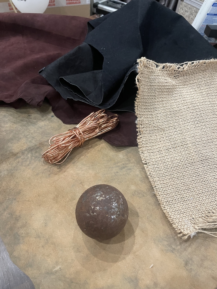 В трюме были найдены куски кожи и спилка для тубуса карты. Ну негоже волохать кусок ткани без чехла, еще руки вытрут об него или вообще лицо небритое. Поэтому решено делать карту на парусине. Можно взять шторину, простынину или жалюзину. Я взял первое, оно сейчас напитывается историей в ведре, чтобы потом не стыдно было перед настоящими искателями сокровищ. Так же было найдено ядро, которым будет притоплен озерный клад. Хорошее ядро, сколько им не стреляли, а оно обратно возвращалось…