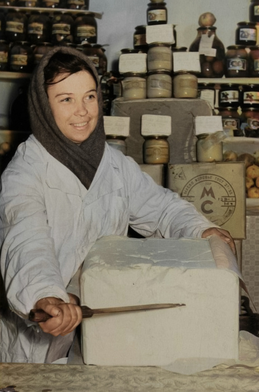 В палатке №2 ОРСА треста №23. Продавец Маша Гаврикова, 1958 год.