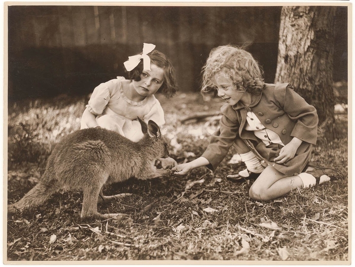 Дети кормят детеныша кенгуру в национальном парке, Кариджини 1932 год.