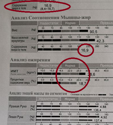 Стало 17 кг и 19%. Удалось привести в норму! Причем мышечная масса практически не изменилась (42,6 -> 42,3)!