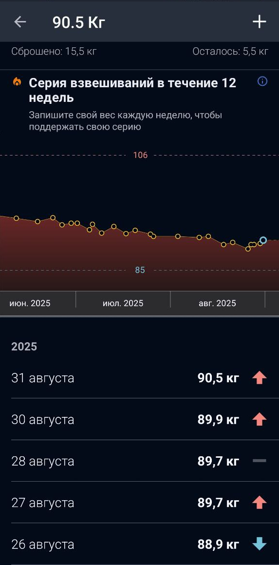 Под конец решил взвешиваться ежедневно, интересно было, возьму 90 кг или нет. 4 дня на неделе вес уходил ниже 90, один раз ниже 89. Так что считаю, что планка взята.